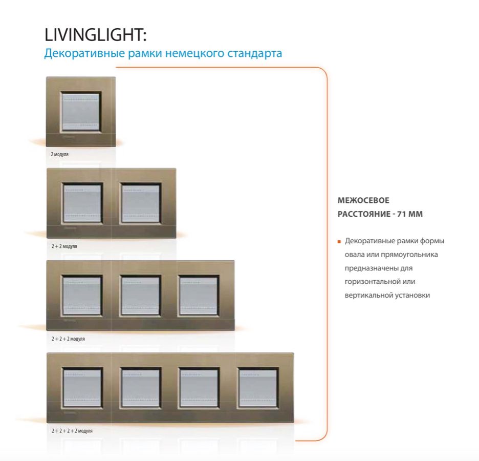Компания Bticino выпускает рамки максимально размером 4 поста (2+2+2+2 модуля). На схеме внизу варианты декоративных рамок немецкого стандарта.
