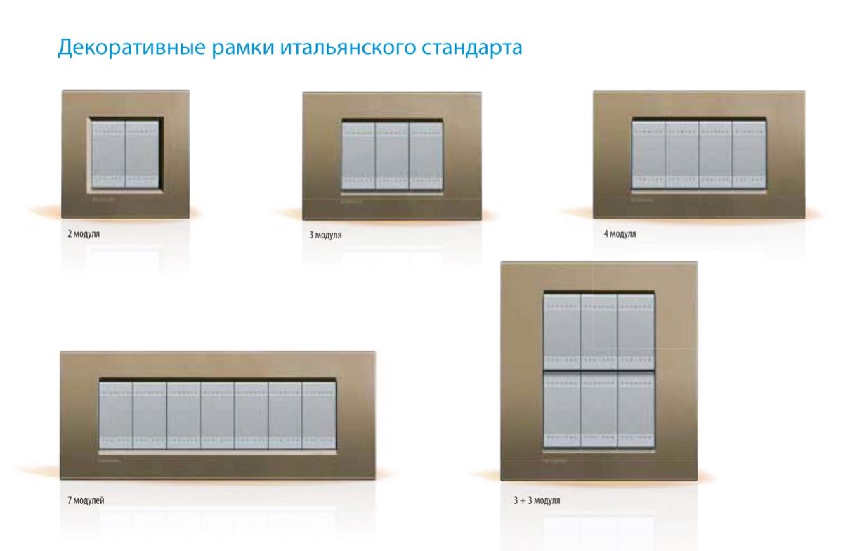 Здесь используется монтажная коробка итальянского стандарта. При итальянском стандарте декоративные рамки не имеют перемычек, между каждыми двумя модулями. Декоративные рамки, суппорта и монтажные коробки имеют размер: два, три, четыре, семь модулей ( LivingLight), шесть модулей (Axolute) и 3+3 модуля. При таком монтаже меньше ограничений на размер используемого механизма. Компания Bticino выпускает механизмы размером 1, 2, 3, 4, 6, 3+3 модулей.