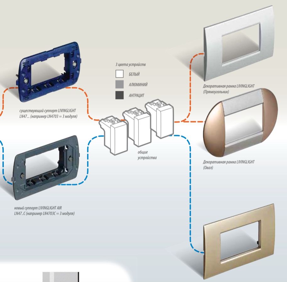 Изделия компании Bticino, делятся на три группы: механизмы, суппорта и декоративные рамки.