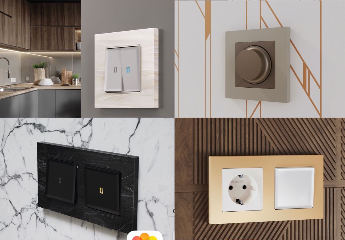 Ассортимент включает: рамки, комплекты механизмов, лицевые панели, механизмы розеток и выключателей.