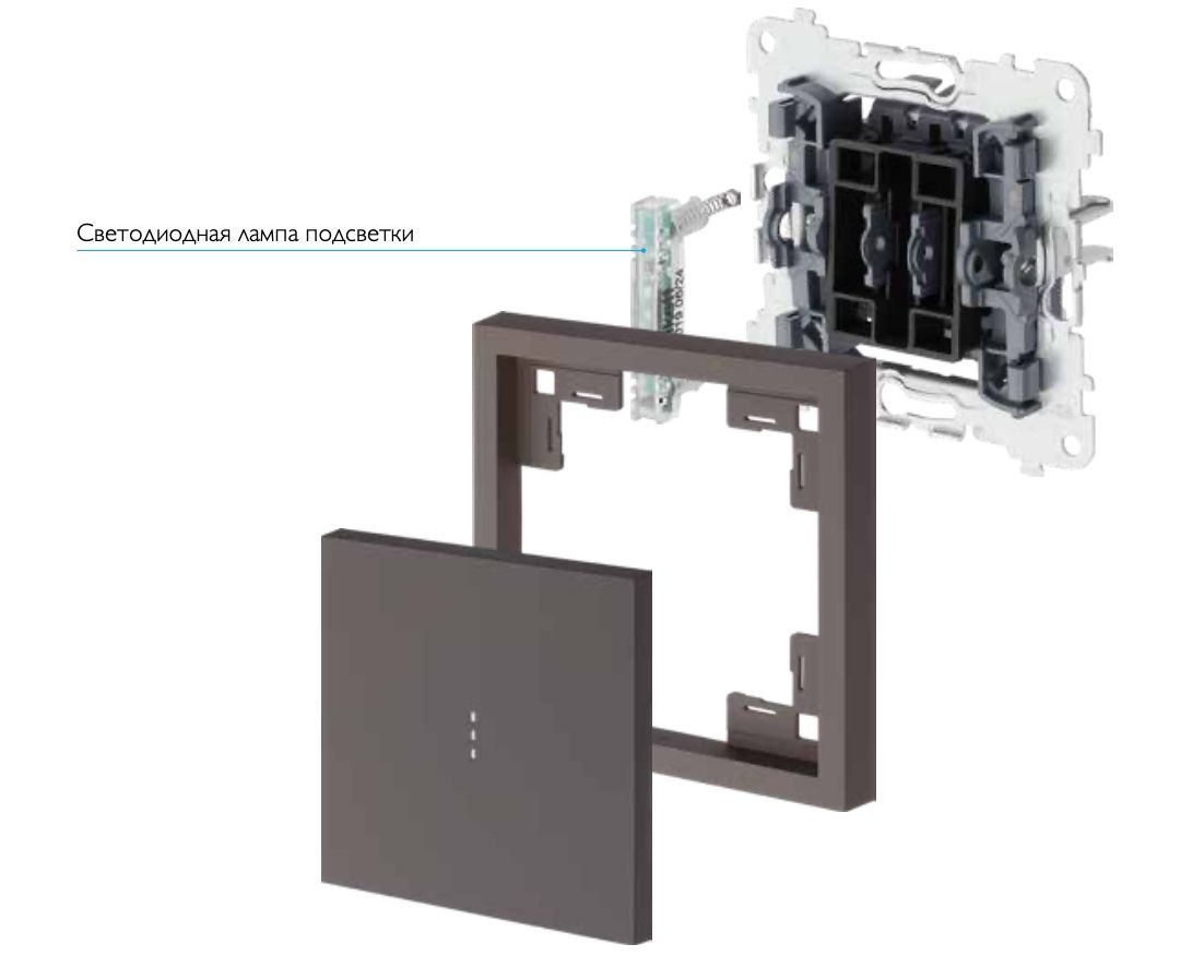 Защелкивается в корпус механизма выключателя с фронтальной стороны.